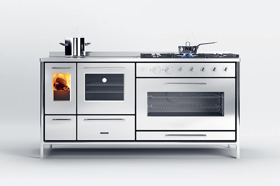 L’idée naît sur un petit stand du salon Progetto Fuoco à Vérone. Un poêle rustique, fonctionnant aux deux combustibles, inspire une nouvelle réflexion.