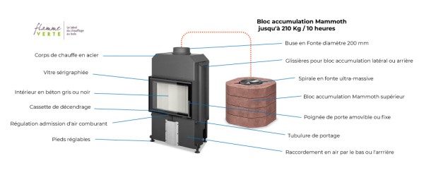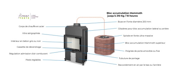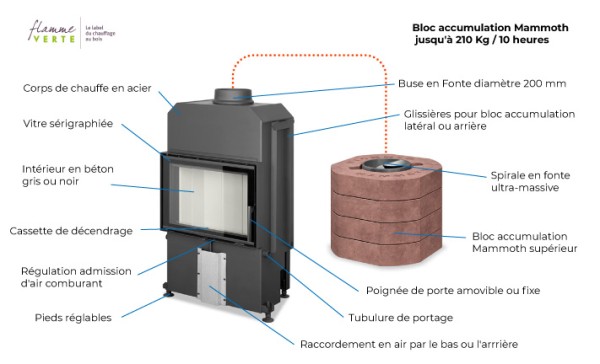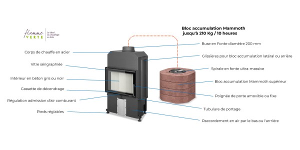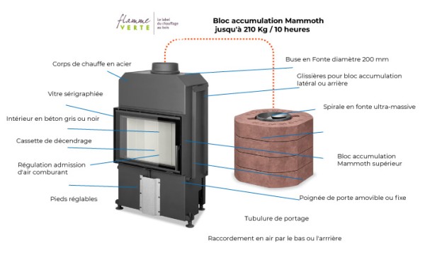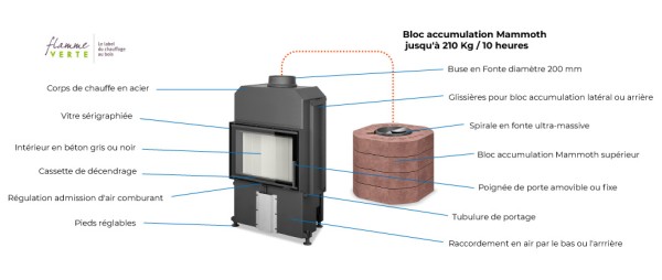 Ce foyer de cheminée est compatible avec plusieurs modules d’accumulation Mammoth, conçus pour prolonger la restitution de chaleur :