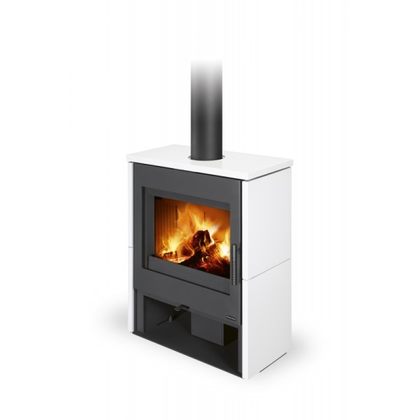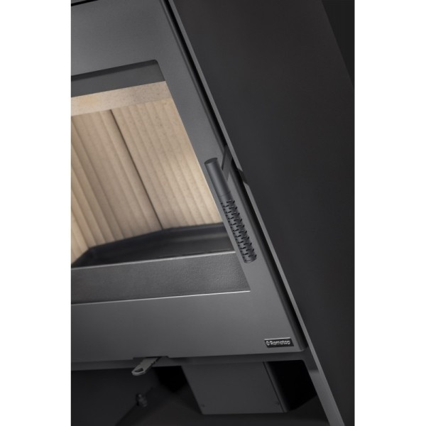 La régulation de l'alimentation en air primaire et secondaire est contrôlée par un seul élément de commande et des réserves de bois plus petites peuvent être stockées dans la partie inférieure du poêle.