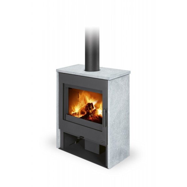 En standard, il est possible de raccorder la sortie des fumées supérieure ou arrière. Grâce à l'alimentation en air secondaire, la vitre de la porte reste propre. La chambre de combustion est recouverte de pierres en argile réfractaire .