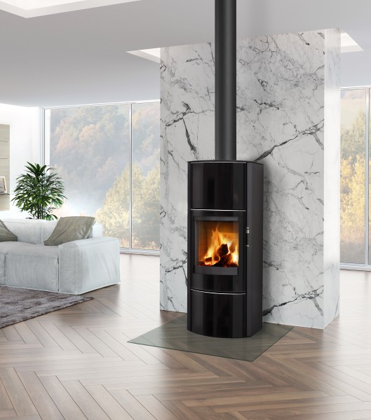Le poêle à bois ECUADOR H EX se caractérise par une forme rectangulaire et une vitre légèrement courbée.