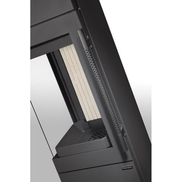 Le poêle est également équipé d’un verrouillage automatique de la porte, d’une grande poignée en acier noir inoxydable ventilée, alliant sécurité, ergonomie et esthétisme.