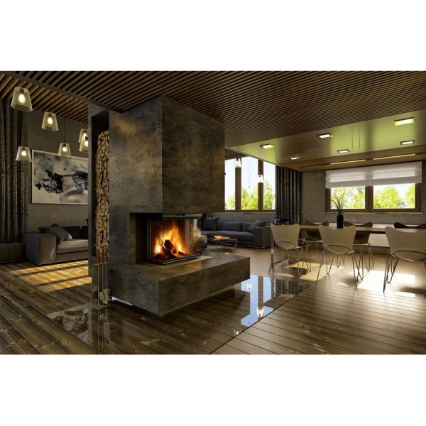 Foyer de cheminée avec porte relevable et 2 angles Des proportions soigneusement équilibrées, des lignes épurées et un large vitrage dominant, font de l'insert de cheminée d'angle IMPRESSION avec porte relevable le choix idéal.