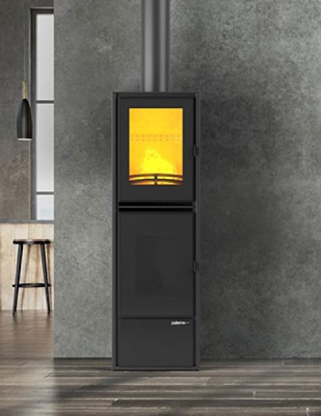 PATERNO Integra est un poêle hybride bois + granulés à double foyer superposé : moins encombrant qu’un modèle latéral, avec autonomie, compacité et design discret.