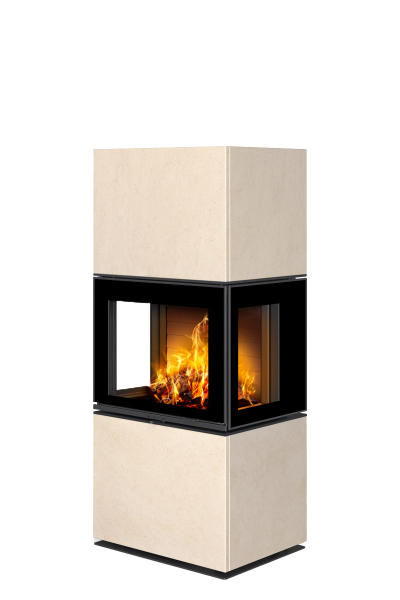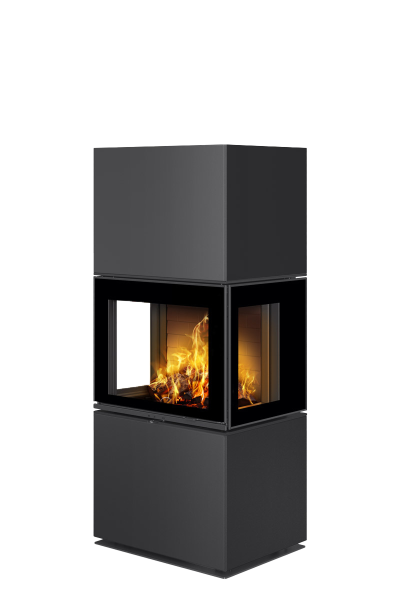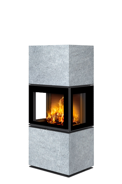 Le cœur de l’appareil repose sur une chambre de combustion performante, conçue pour résister aux contraintes thermiques élevées. Proposée avec un foyer en béton noir ou blanc, elle favorise une combustion efficace tout en participant à l’identité visuelle du produit. Les surfaces vitrées latérales, associées à un vitrage haute résistance, amplifient la perception du feu et améliorent le confort thermique global.