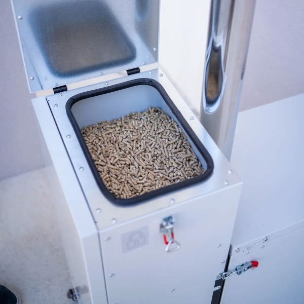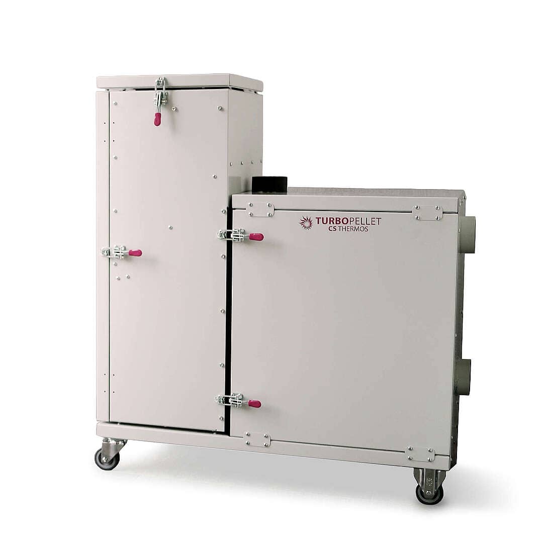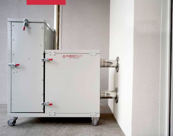 Le systÚme électronique ajuste automatiquement la combustion grùce à une télécommande intelligente avec fonction thermostat. Un chauffage à pellets mobile et flexible Monté sur roues, Turbopellet est :
